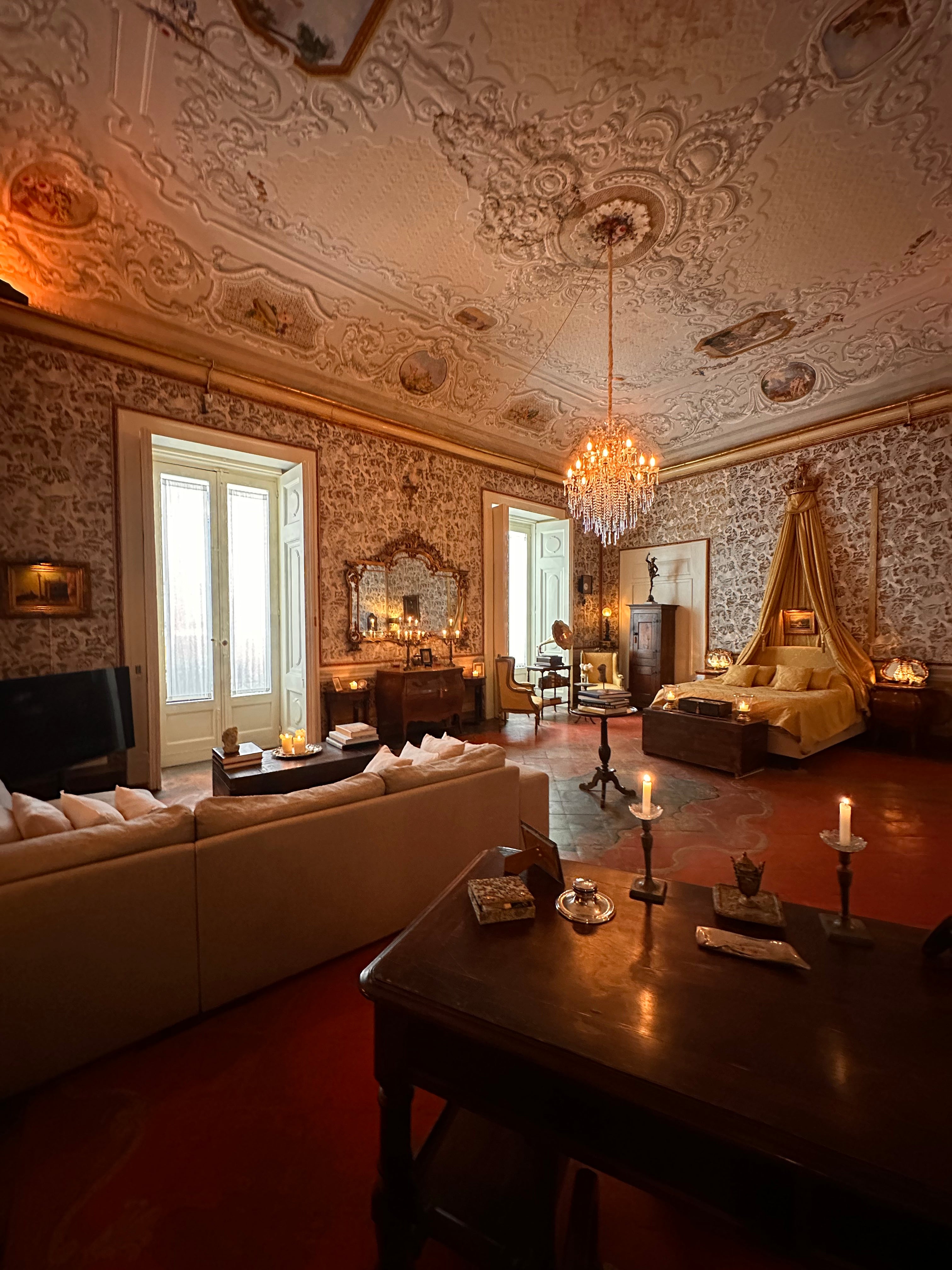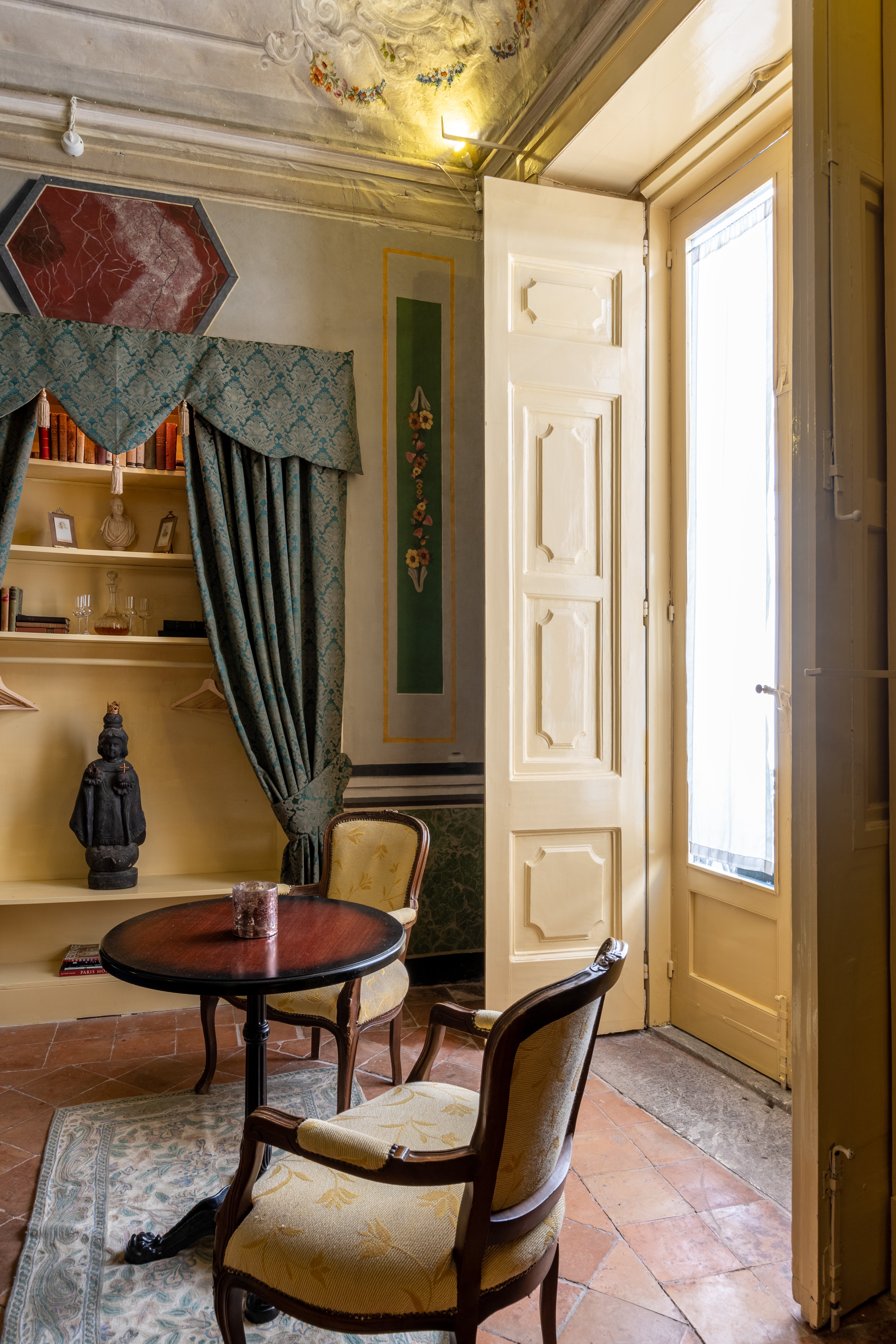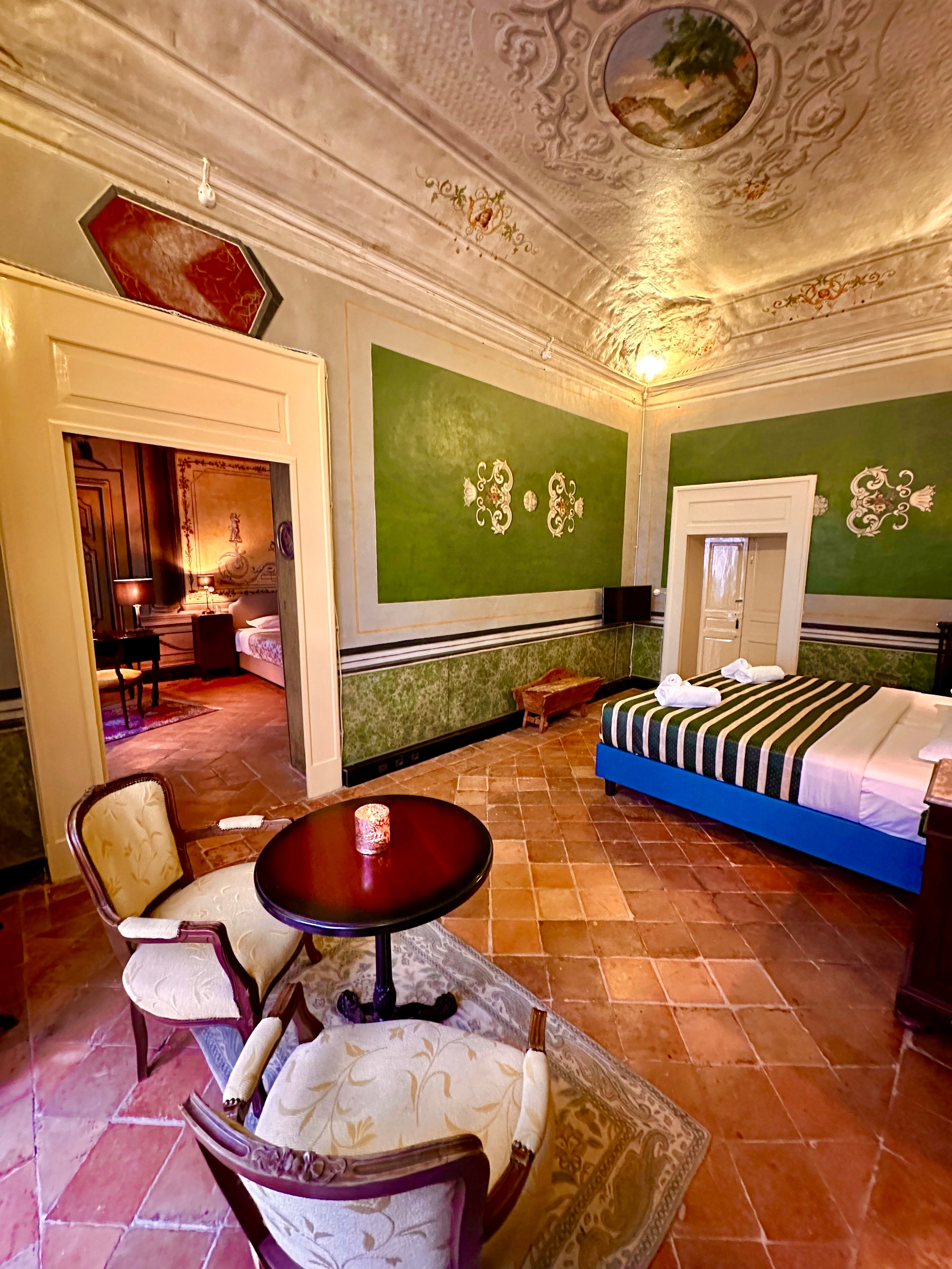 Die Suite IV ist ideal für Familien oder Freundesgruppen, die gemeinsam reisen. Sie besteht aus zwei angrenzenden Zimmern – eines in Salbeigrün, das andere in Ocker – und bietet sowohl Privatsphäre als auch Geselligkeit. Zur Ausstattung gehören zwei Badezimmer: eines mit Dusche und Waschbecken sowie eines mit Dusche. Die edlen Farben und die restaurierten Decken schaffen eine warme, zeitlose Atmosphäre.
