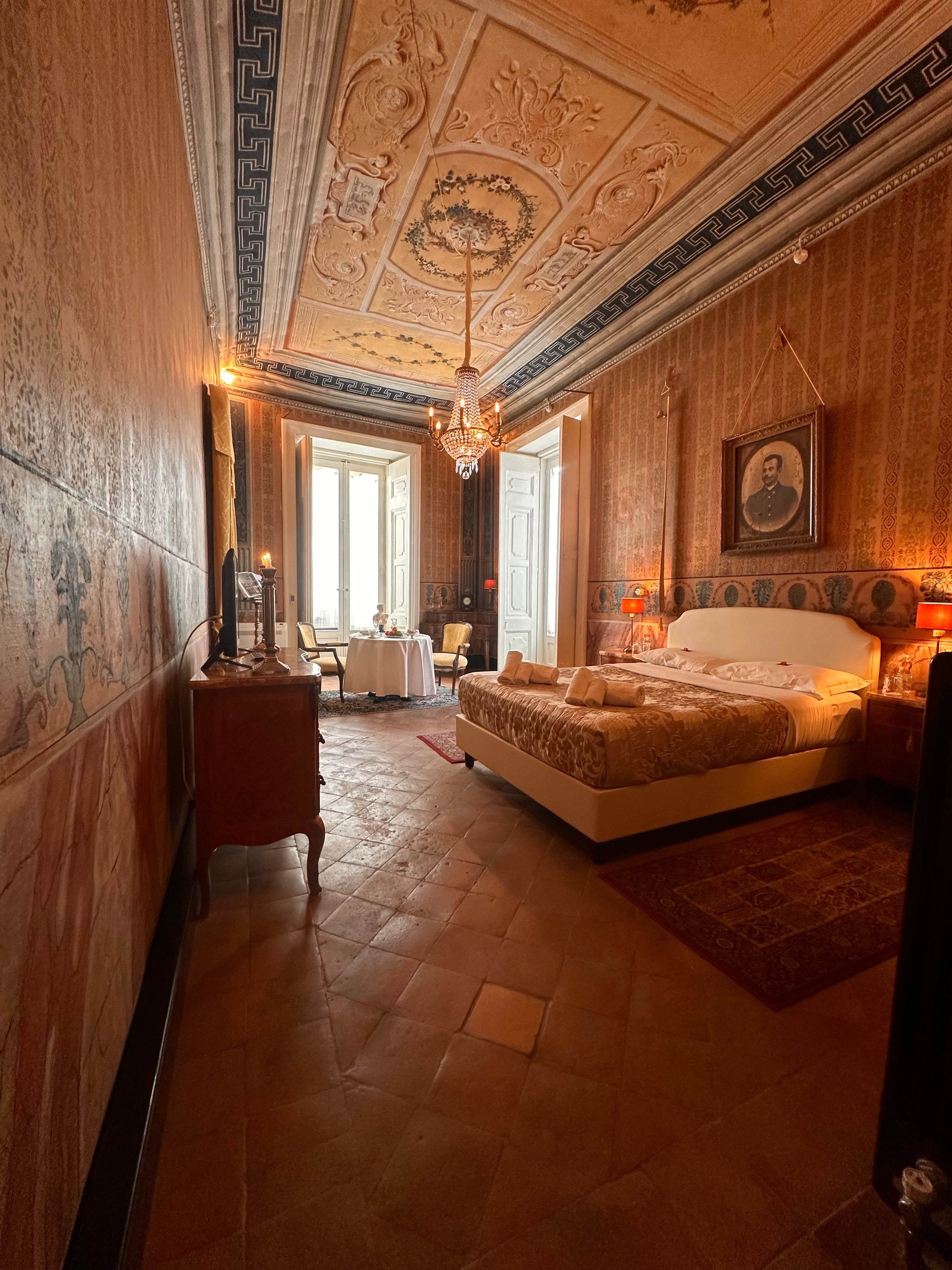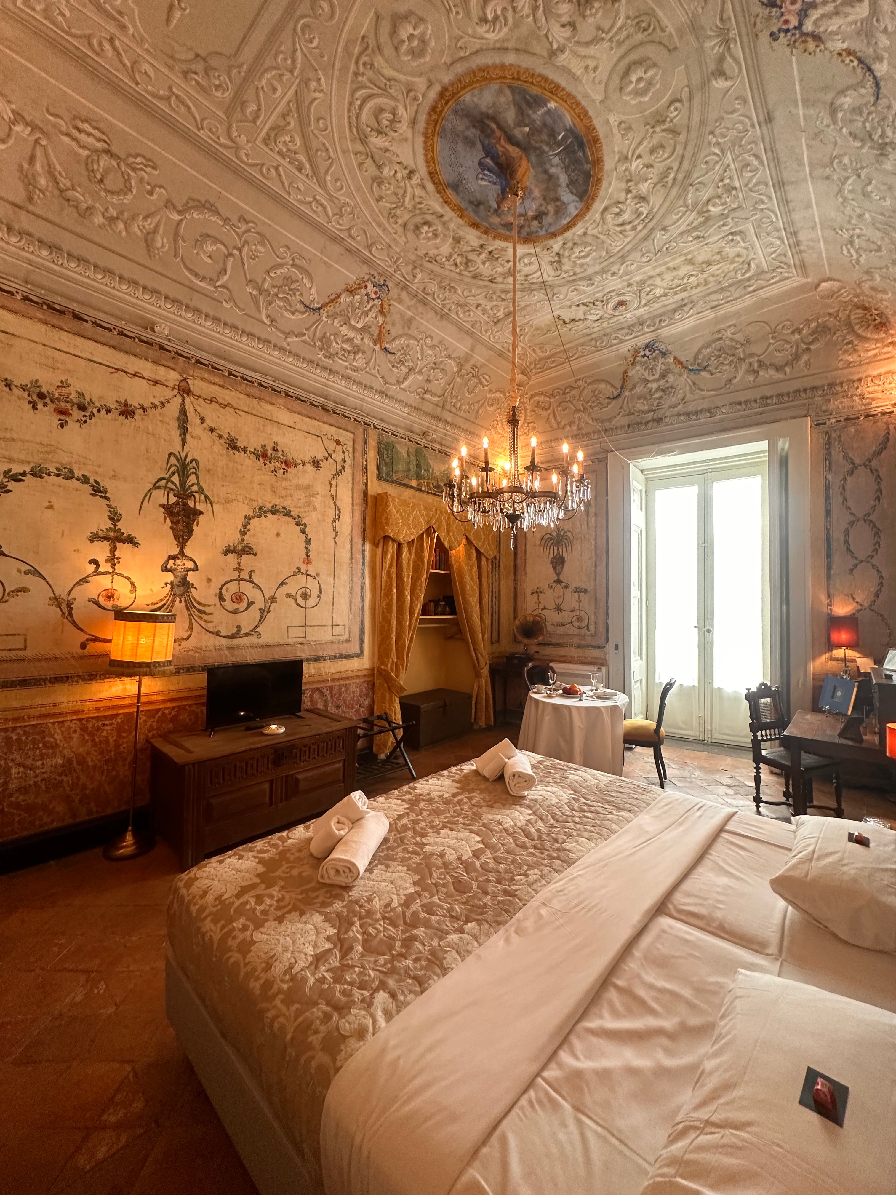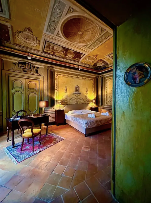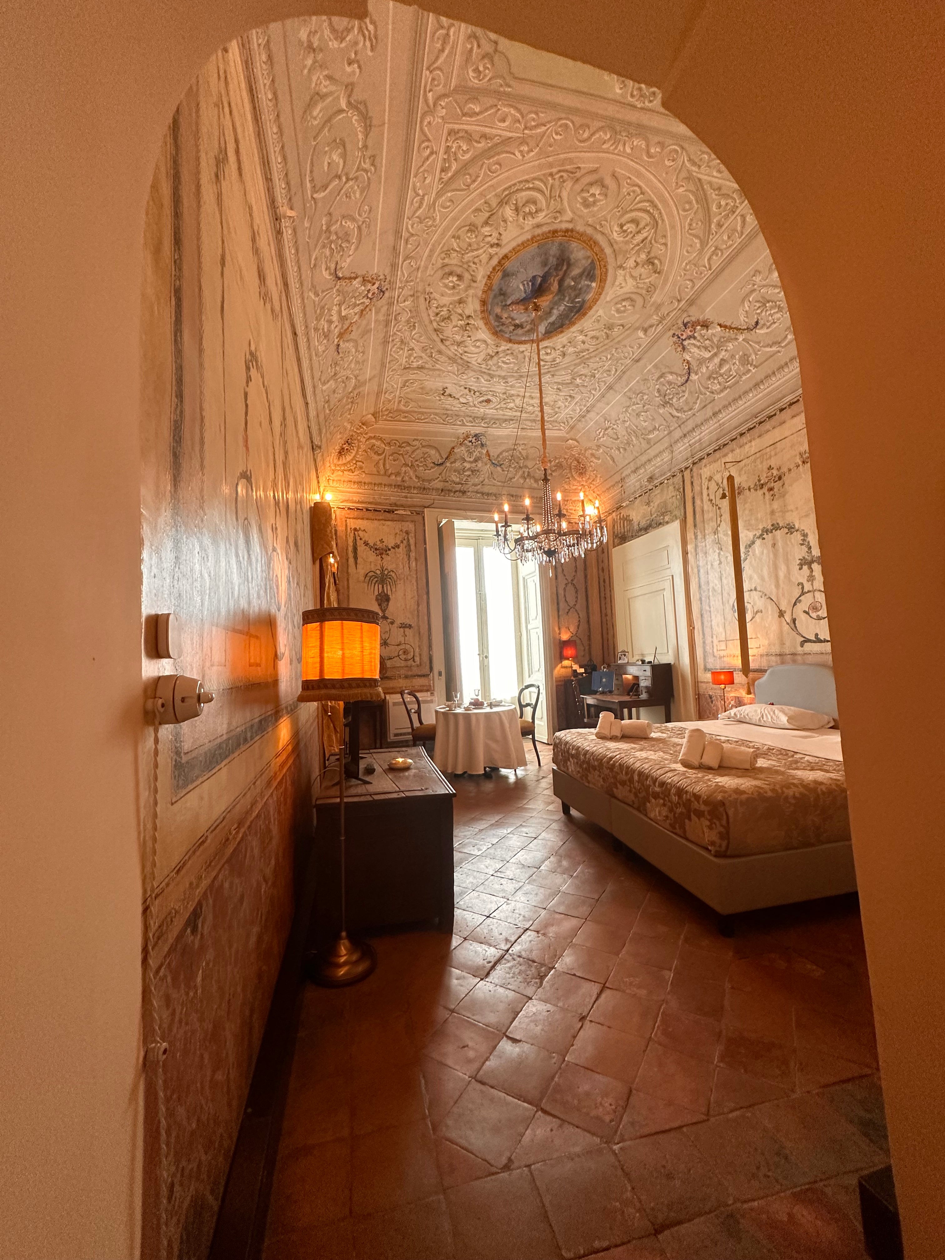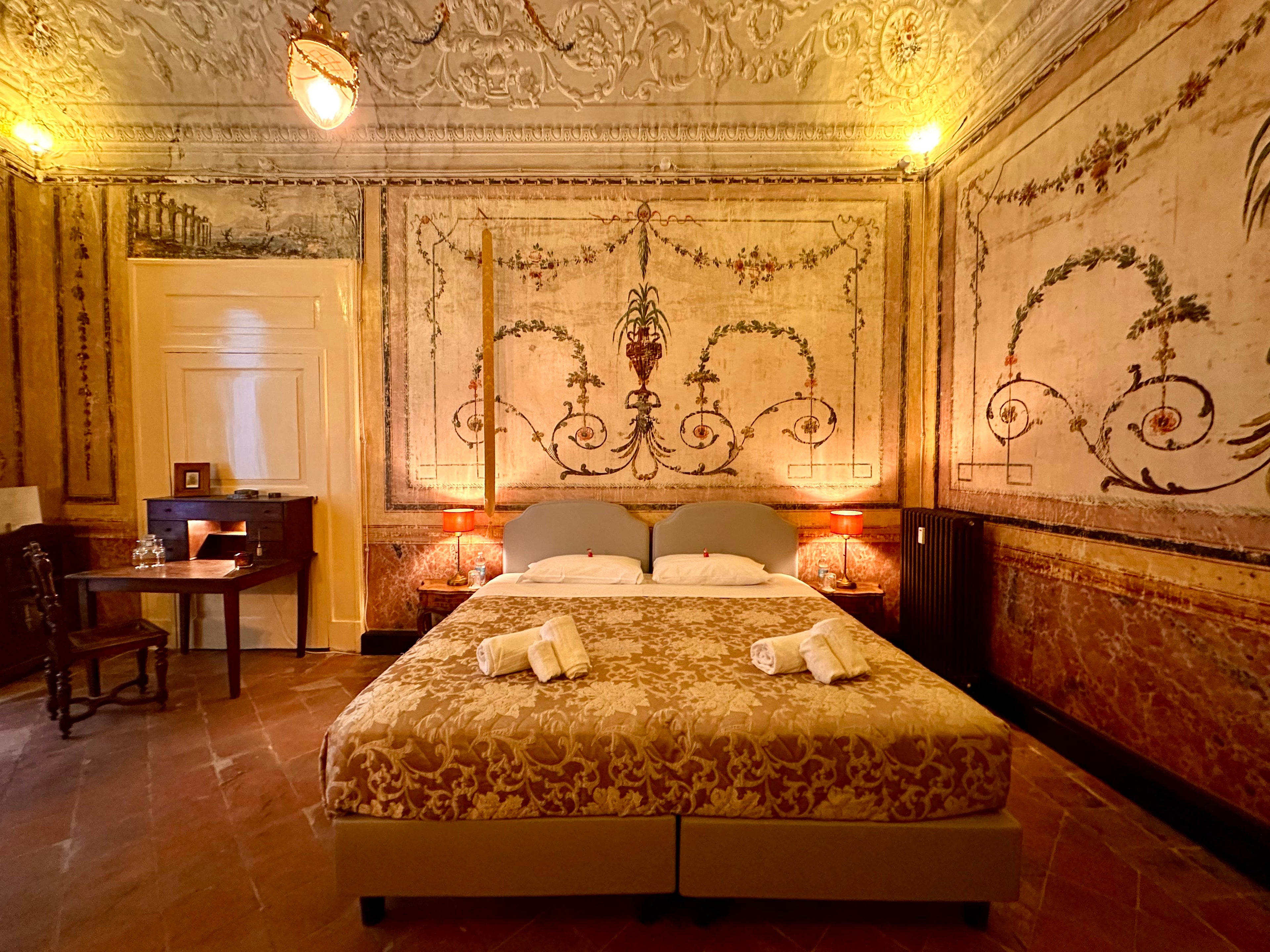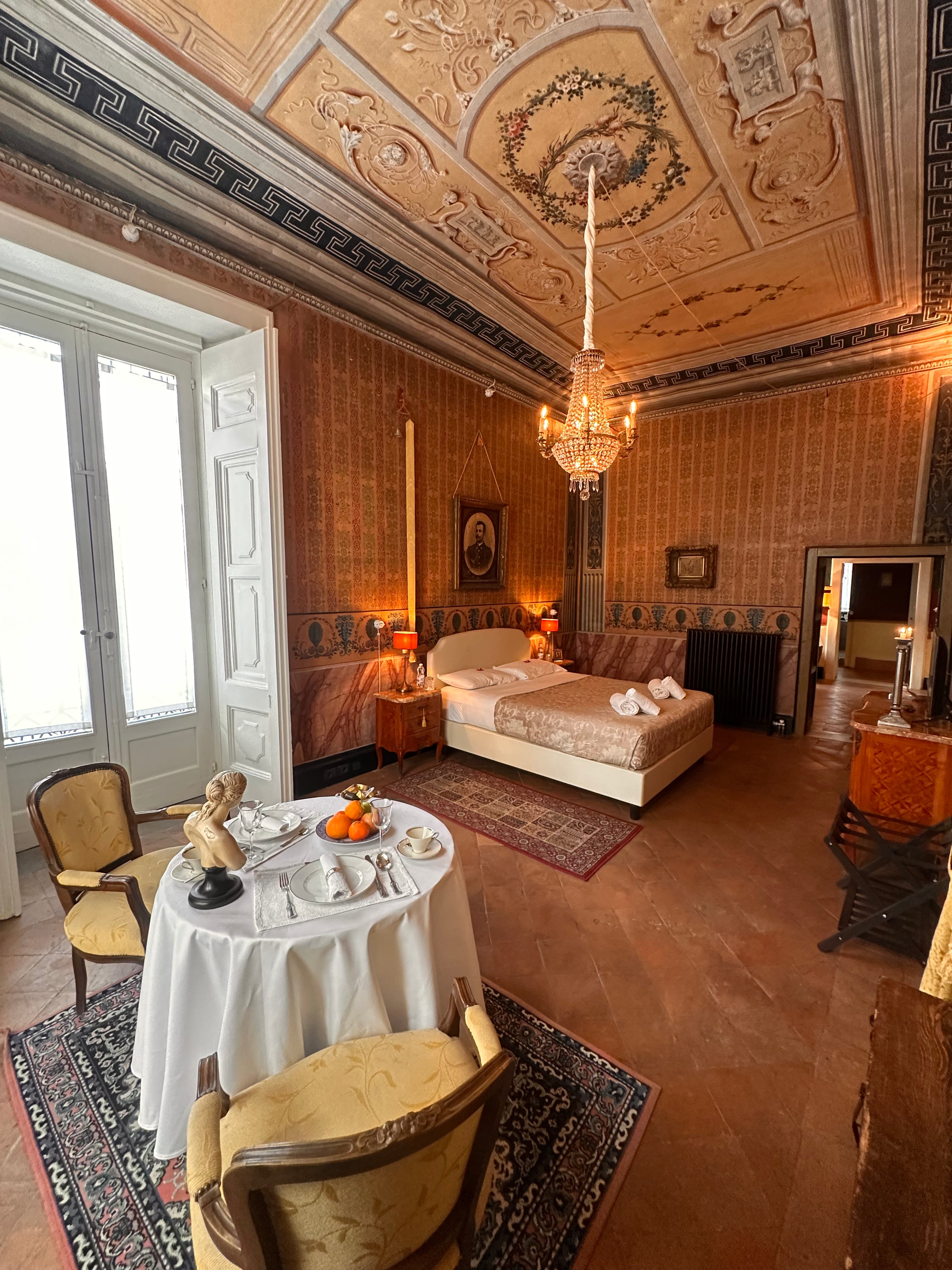 Die Suite II, eines der größten Zimmer der Casa Santangelo, besticht durch eine der beeindruckendsten Deckenfresken des Hauses. Der Raum strahlt mit seinen hohen Fenstern und der harmonischen Farbpalette eine stille Erhabenheit aus. Die Suite verfügt über ein eigenes Badezimmer mit Bidet und bietet die perfekte Balance zwischen historischem Charme und Komfort – ideal für Gäste, die einen stilvollen Aufenthalt in einem historischen Ambiente suchen.
