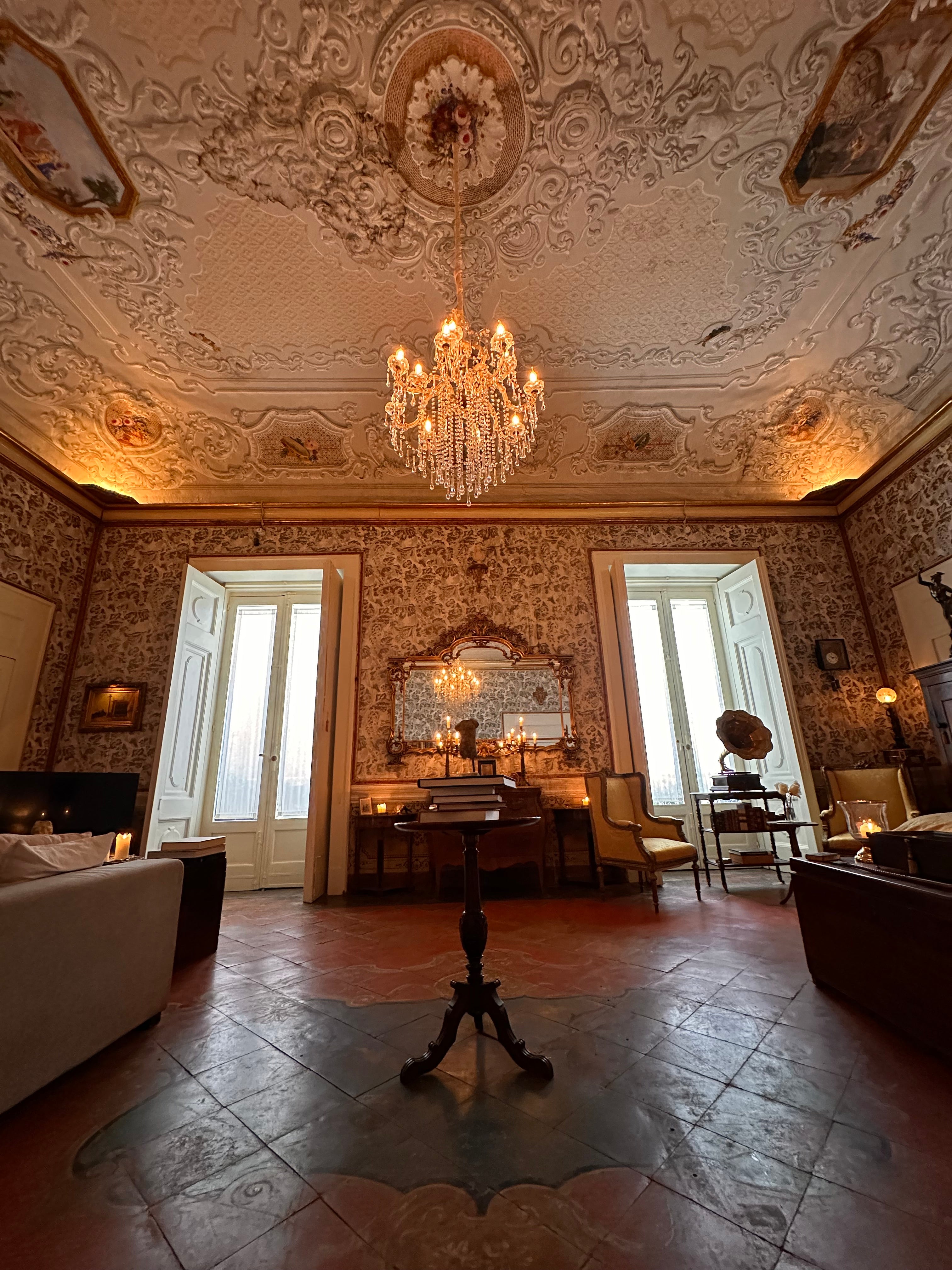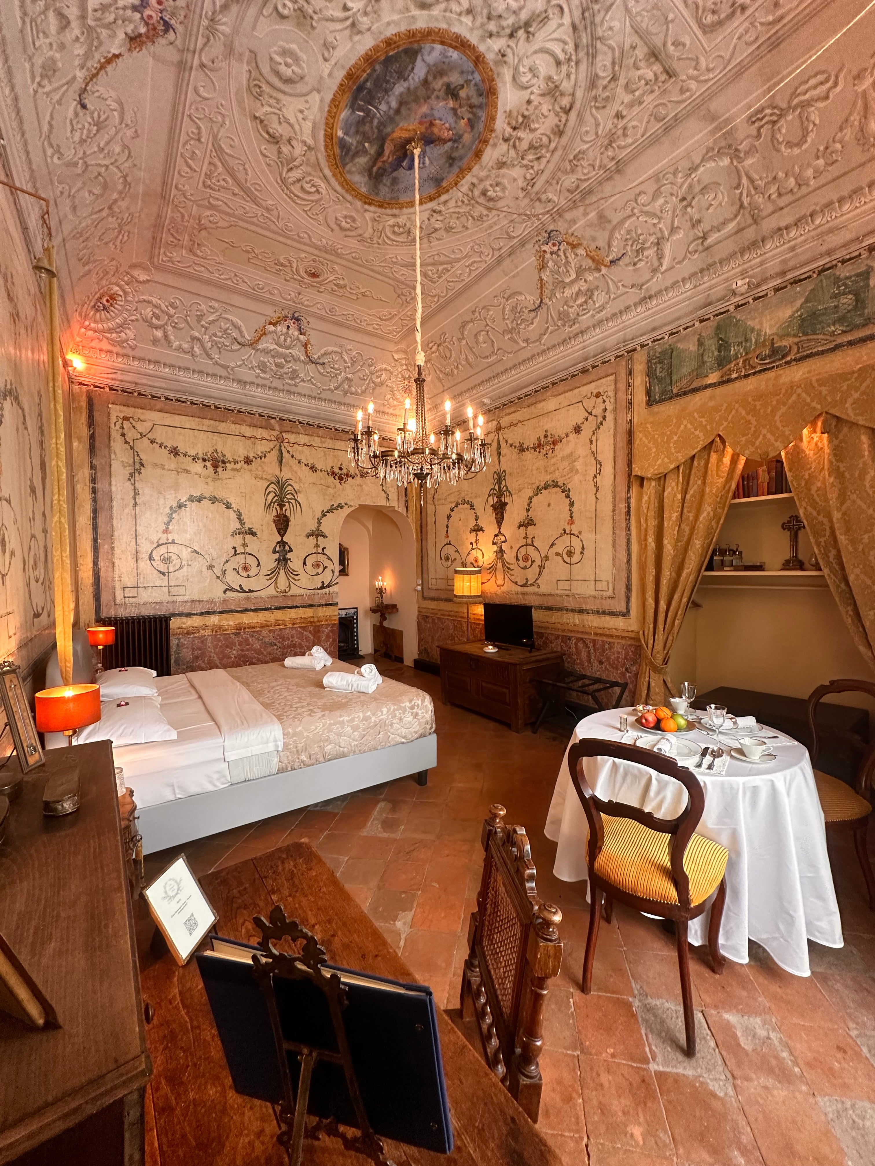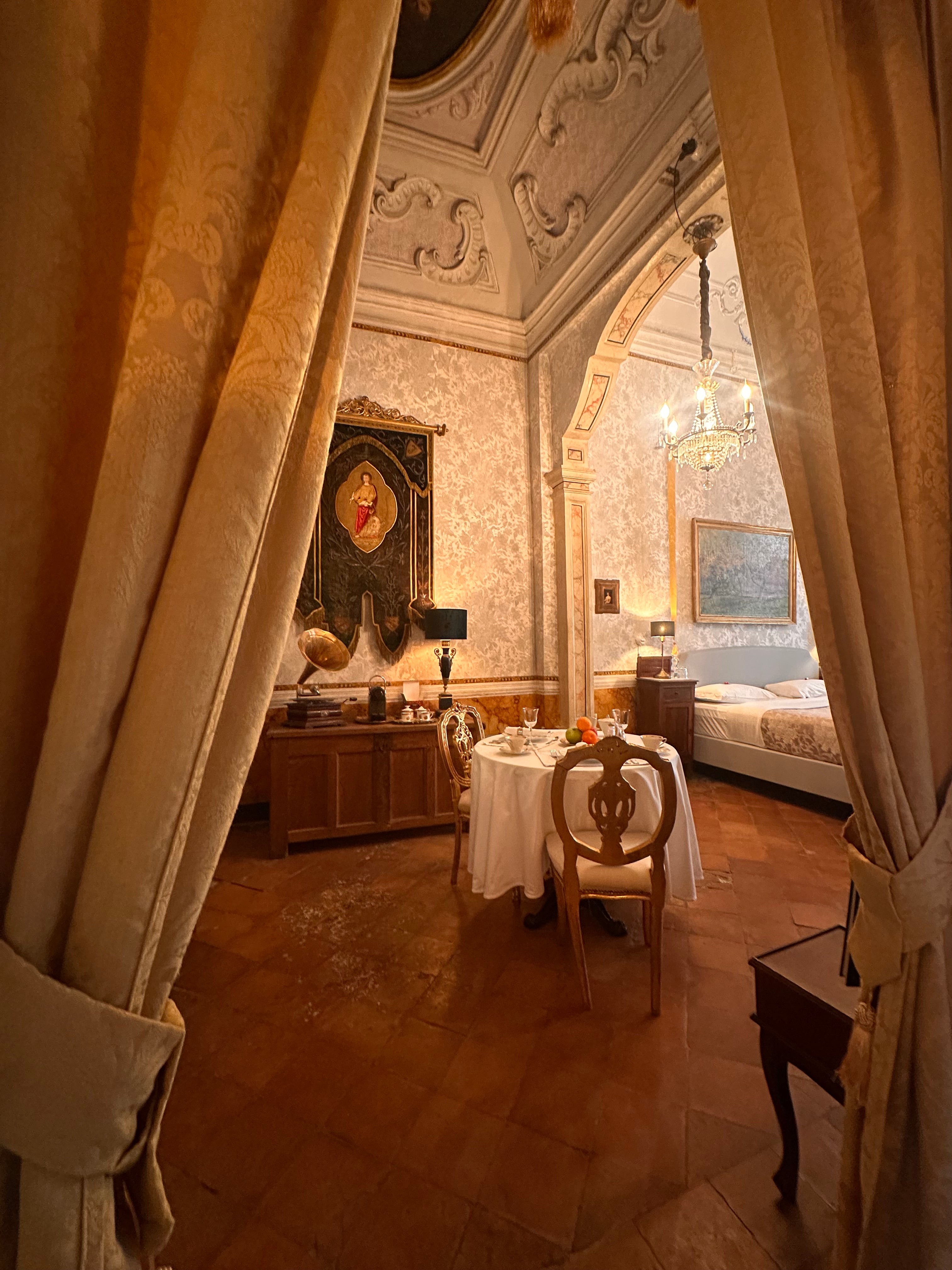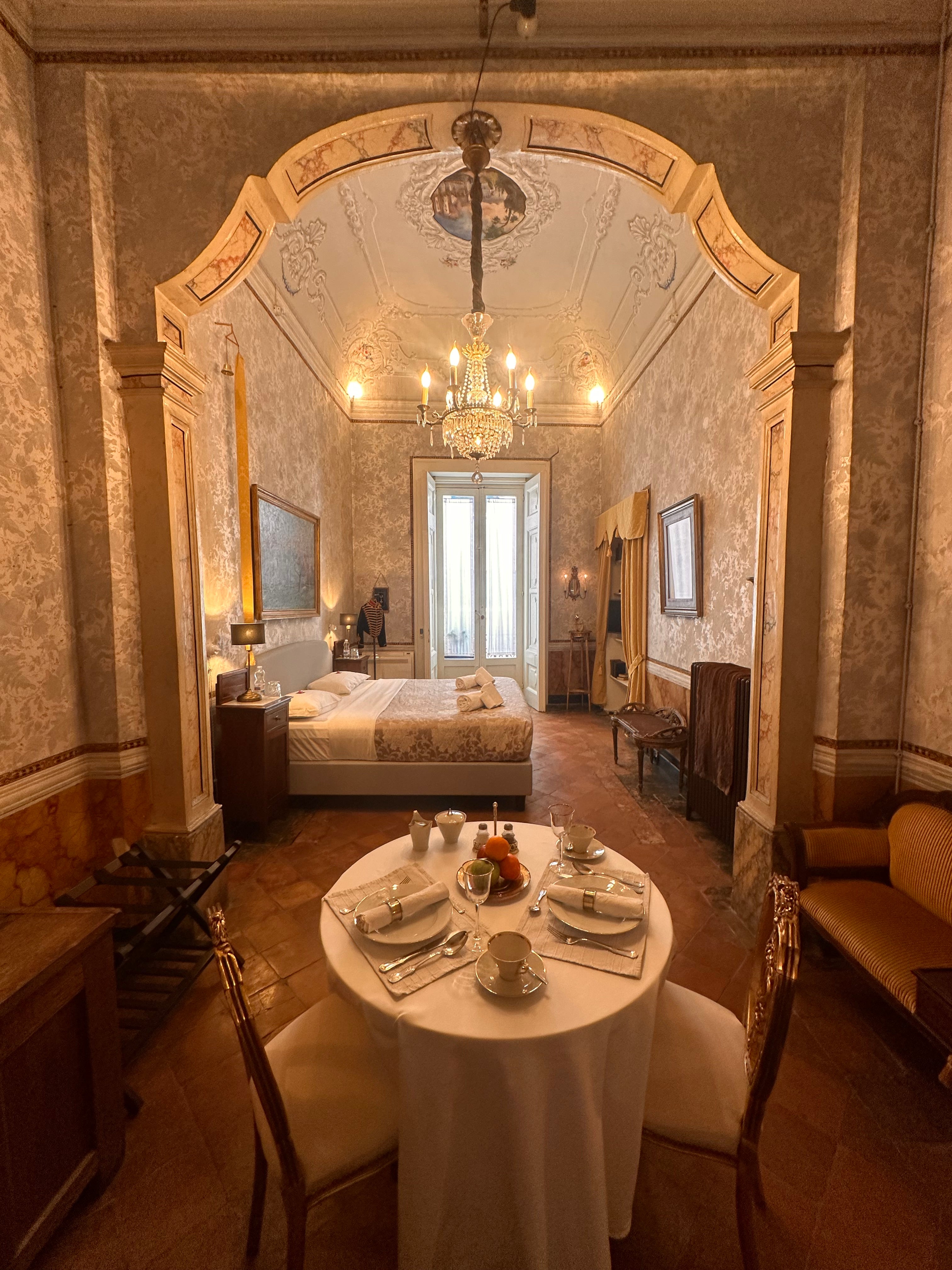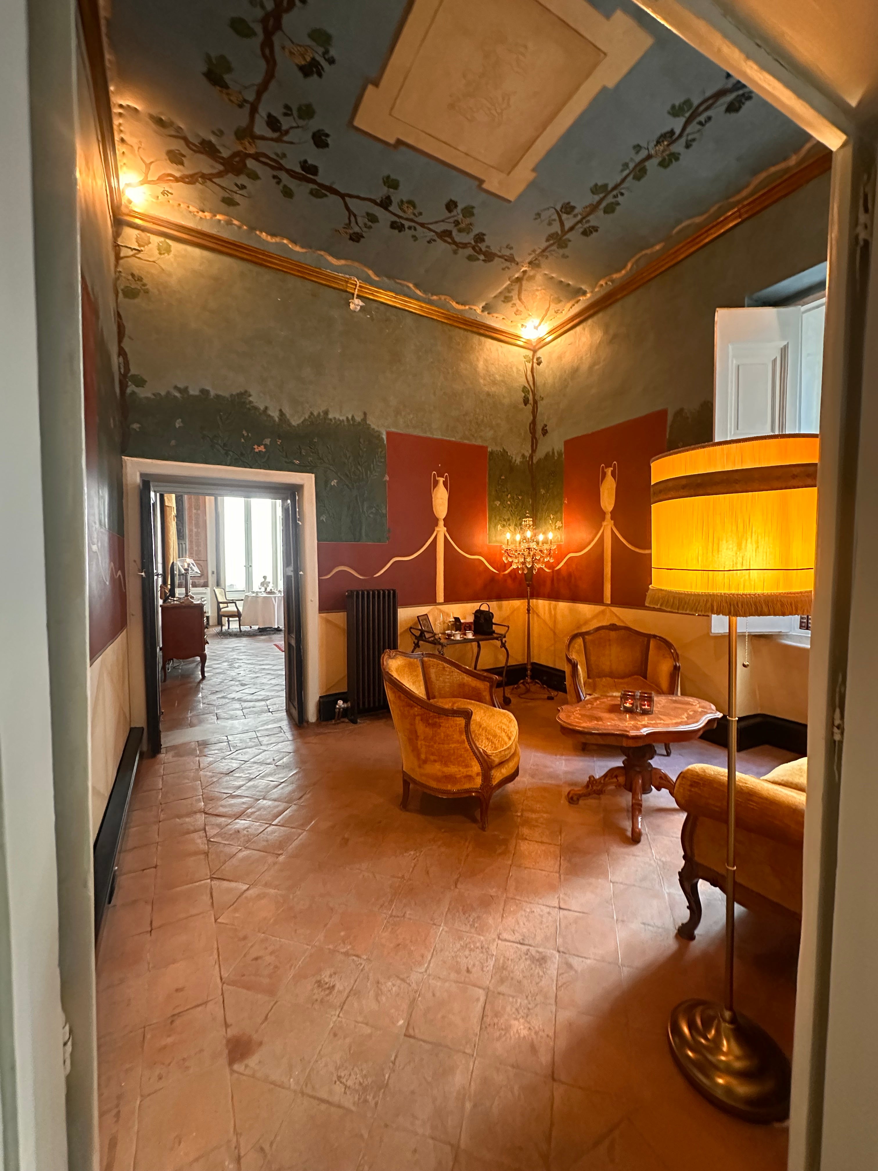 Die Suite II, eines der größten Zimmer der Casa Santangelo, besticht durch eine der beeindruckendsten Deckenfresken des Hauses. Der Raum strahlt mit seinen hohen Fenstern und der harmonischen Farbpalette eine stille Erhabenheit aus. Die Suite verfügt über ein eigenes Badezimmer mit Bidet und bietet die perfekte Balance zwischen historischem Charme und Komfort – ideal für Gäste, die einen stilvollen Aufenthalt in einem historischen Ambiente suchen.